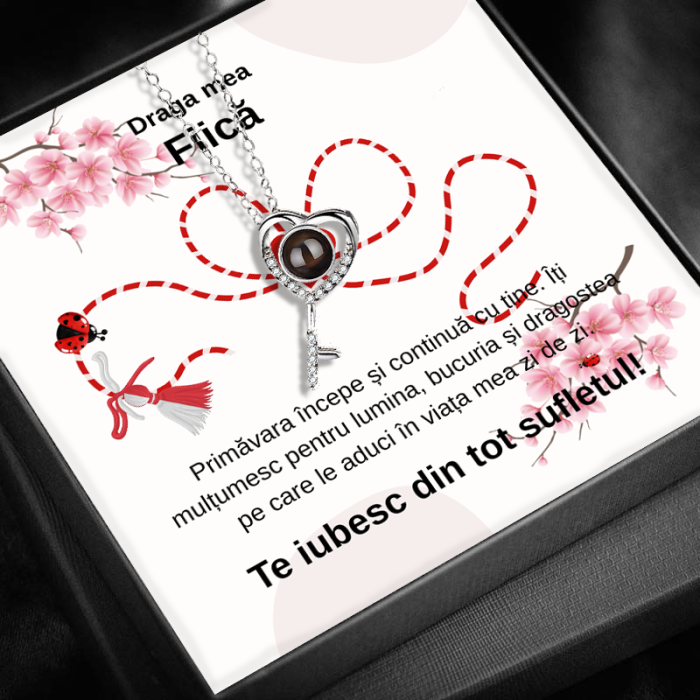 Imaginează-ți emoția și bucuria din ochii fiicei tale atunci când deschide cutiuța elegantă și descoperă colierul „Cheia Destinului” – un simbol al iubirii necondiționate și al legăturii unice dintre părinte și copil. O bijuterie delicată, cu o semnificație profundă, care exprimă protecție, încredere și susținere la fiecare pas din drumul ei.