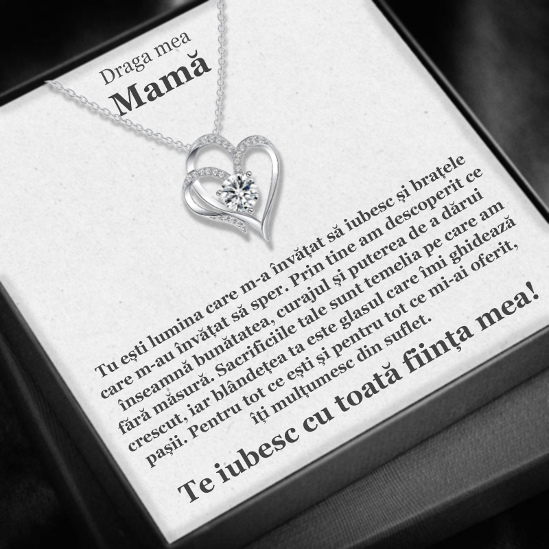Închipuie-ți emoția din ochii mamei tale atunci când deschide cutiuța și descoperă colierul elegant Inima Eternă. O bijuterie care exprimă fără cuvinte profunzimea legăturii dintre voi – o legătură clădită din iubire, grijă și momente neprețuite, ce devine tot mai puternică odată cu trecerea timpului. Pandantivul, împodobit cu cristale cubic zirconia, strălucește delicat, reflectând căldura, blândețea și frumusețea sufletului tău.