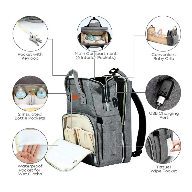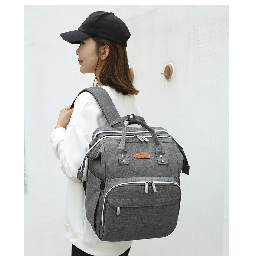 O geanta foarte versatila in care poti impacheta si ordona o multime de articole. Aceasta geanta pentru scutece poate fi folosita ca rucsac, geanta de mana sau poate fi agatata de carucior. Este portivita la plimbare, la cumparaturi sau in calatorii. Designul elegant si unisex face din geanta noastra pentru scutece o alegere buna atat pentru femei, cat si pentru barbati.