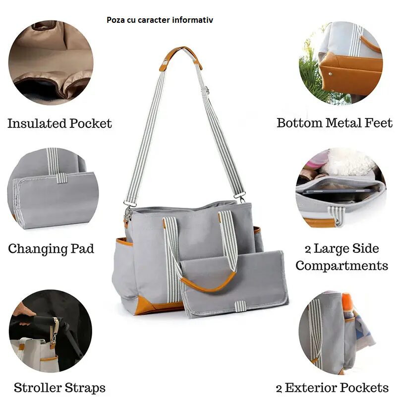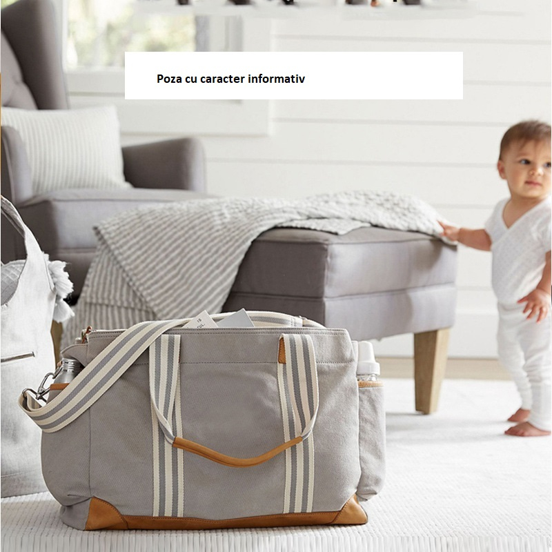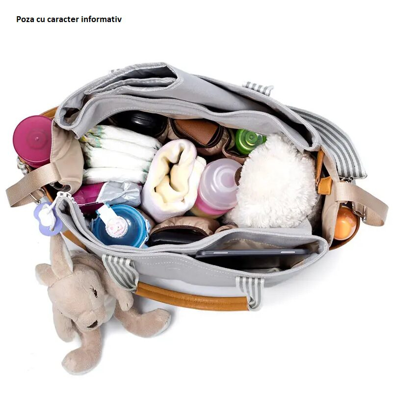 O geanta foarte versatila in care poti impacheta si ordona o multime de articole. Aceasta geanta pentru scutece poate fi folosita ca geanta de mana sau poate fi agatata de carucior. Este portivita la plimbare, la cumparaturi sau in calatorii. Designul elegant si unisex face din geanta noastra pentru scutece o alegere buna atat pentru femei, cat si pentru barbati.
